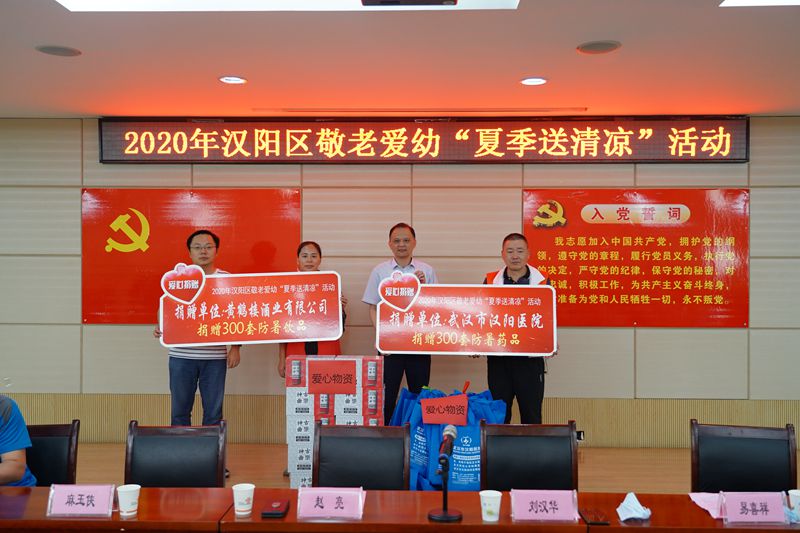 捐贈儀式上,劉漢華,趙亮為活動致辭,易喜祥、麻玉俠代表愛心企業(yè)作分享發(fā)言。黃鶴樓酒業(yè)和武漢市漢陽醫(yī)院分別向漢陽區(qū)敬老愛幼“夏季送清涼”活動捐贈300套防暑飲品和300套防暑藥品,劉漢華,趙亮代表社區(qū)困難群體接受捐贈。