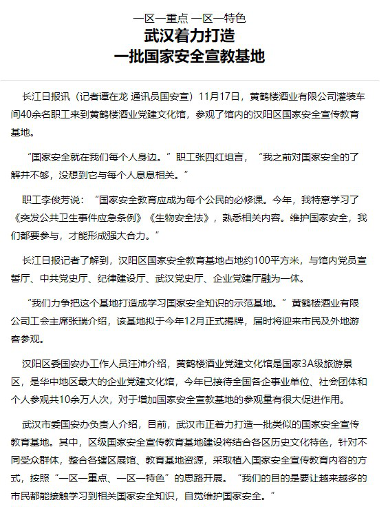 ? ? ? ?近日,黃鶴樓酒業黨建文化館內的漢陽區國家安全宣傳教育基地榮登長江日報。
