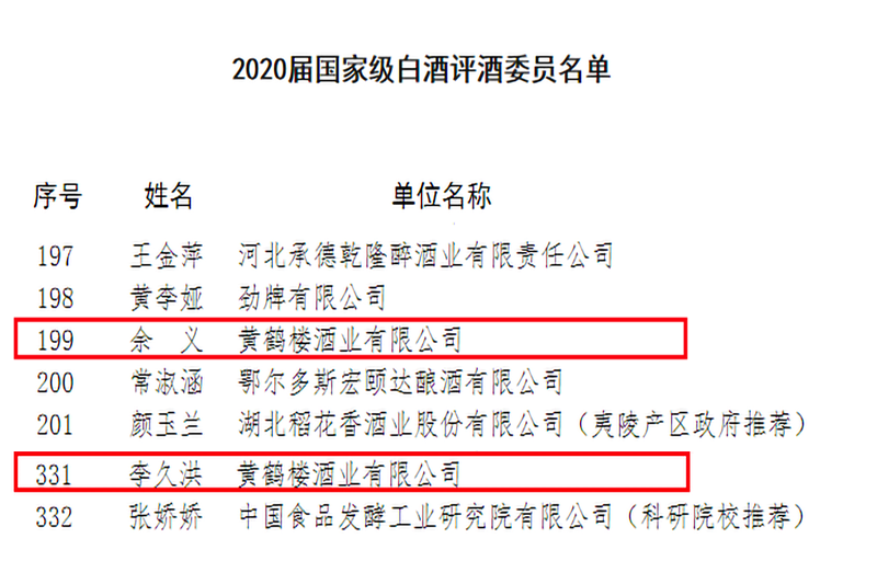 近日,第四屆全國(guó)白酒品酒職業(yè)技能競(jìng)賽結(jié)果公布,黃鶴樓酒業(yè)李久洪、余義獲聘為中國(guó)酒業(yè)協(xié)會(huì)2020屆國(guó)家級(jí)白酒評(píng)酒委員。