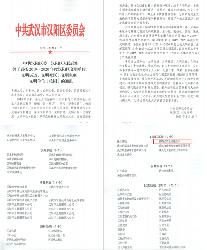 新年伊始喜訊傳,1月21日黃鶴樓酒業被中共武漢市漢陽區委員會授予“2019-2020年度區級文明單位”榮譽稱號。