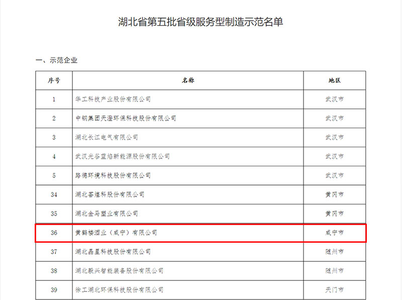 5月30日,湖北省經(jīng)濟和信息化廳公布第五批省級服務(wù)型制造示范名單。黃鶴樓酒業(yè)(咸寧)有限公司獲評第五批省級服務(wù)型制造示范企業(yè)。