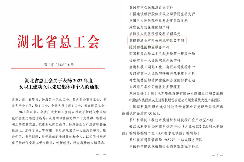 近日,湖北總工會表彰一批2022年度女職工建功立業(yè)先進(jìn)集體和個人,黃鶴樓酒業(yè)咸寧包裝車間喜獲“湖北省女職工建功立業(yè)標(biāo)兵崗”榮譽稱號。
