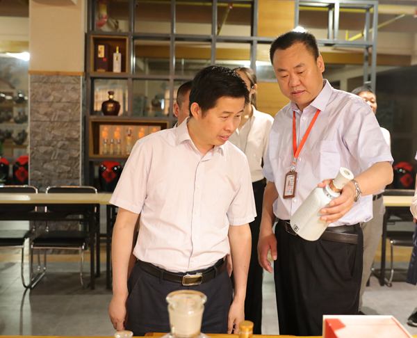 5月28日,漢陽區委副書記范禮奎,漢陽區洲頭街黨工委書記楊紅喜一行到黃鶴樓酒業參觀調研,黃鶴樓酒業黨委書記、董事長許鵬,副總經理麻玉俠,總經理助理魏國陪同調研。