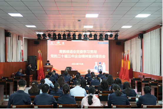 10月30日,黃鶴樓酒業黨委舉行學習貫徹黨的二十屆三中全會精神宣講報告會,公司高管麻玉俠、黃曉文、魏國出席會議,黨委委員、技術質量中心總監李良,黨委委員、釀造管理中心總監孫培彬現場參會,黨委委員、咸寧子公司總經理謝毅視頻參會,江漢大學馬克思主義學院副院長王飛受邀講課。
