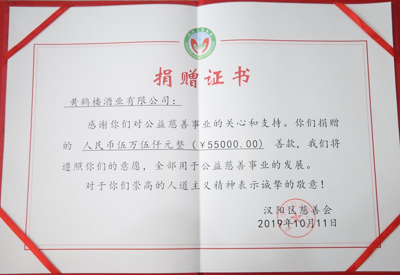 近日,黃鶴樓酒業“金暉助學”共資助11名貧困大學生,捐出助學金5.5萬元,漢陽區慈善會特授予捐贈證書。
